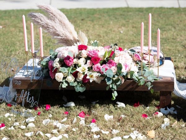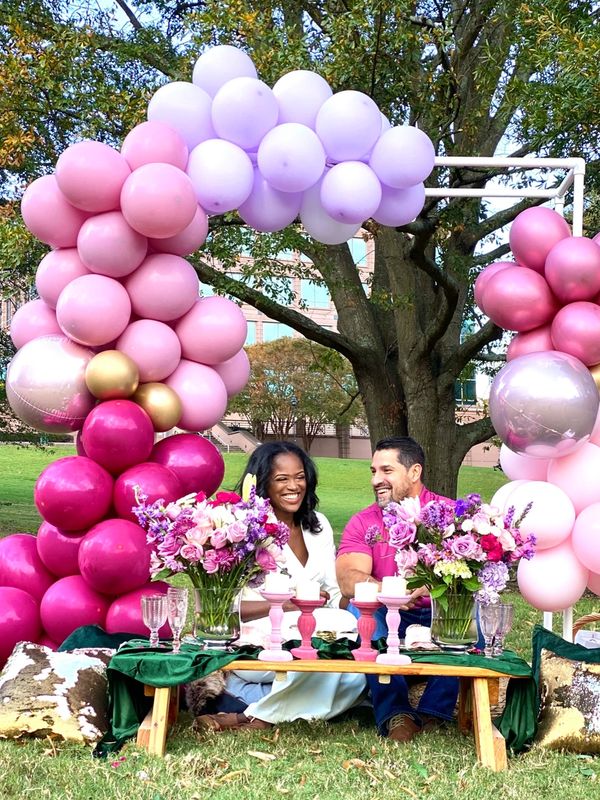 A 2 1/2-hour service for two with setting up and taking down, Decor color of your choice, Picnic Tables, Glasses, Napkins, Plates, Silverware, Pillows, One Floral arrangement, pillows and bamboo ottomans and candles. When it comes to curating the perfect tablespace, every detail, from the real dinnerware to the linens, counts. Yet there's one element that typically stands out from the rest: The flower arrangement. We scout the perfect location, set it up give a luminous feel, and then we clean up every detail giving the patron the freedom to walk off reminiscing about their experience